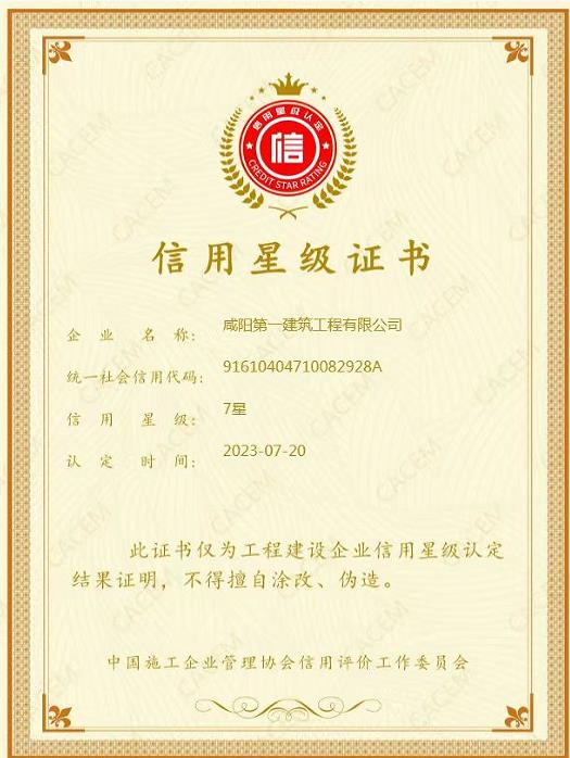為加快推動工程建設(shè)行業(yè)信用體系建設(shè),中施協(xié)下發(fā)了《工程建設(shè)企業(yè)信用星級管理辦法》文件,并組織開展2023年工程建設(shè)行業(yè)“誠信授星活動”。我公司按文件要求積極申報,經(jīng)過陜西省建筑業(yè)協(xié)會推薦,中國施工企業(yè)管理協(xié)會的層層嚴(yán)格評選,于2023年7月20日正式公布評定結(jié)果,我公司被中國施工企業(yè)管理協(xié)會認(rèn)定為“2023年第十批工程建設(shè)企業(yè)信用星級企業(yè)”,榮獲“七星級信用”稱號,并獲得了中施協(xié)頒發(fā)的信用星級證書。